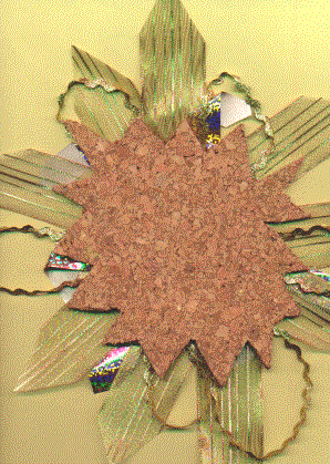 Put up the background and the banner. Use rounds of cork for the centers of the flowers, and use leftover scraps of gold ribbon from the petals.