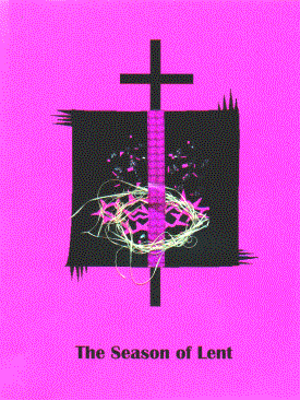 Copy the cover on purple or magenta card stock. Use burlap for the banner, sprinkling it with a small amount of purple or silver glitter to represent ashes--wearing sackcloth (or burlap) and ashes is an Old Testament sign of mourning or sorrow. Leave the cross black, or cover it with strips of balsa wood or sandpaper.