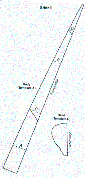 Fold the flat piece of paper downward on the dotted lines. Open the folds, fold the snake in half and refold. Open the snake out flat and refold, using the diagonal lines to give shape to the snake.