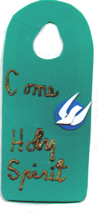 Cut the door hanger from green fun foam. Cut the circle from blue foam and the wings and body of the dove from white foam. It might be interesting to make the flames of fire of the day of Pentecost instead, using red, orange, and yellow foam.