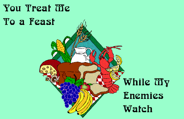 Put up a green background, the banner, and the table. Starting with the bread and wine of communion, let the children add their favorite foods (made from construction paper, foam, and found objects) to the table.