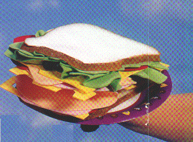 Continue to cut 2-inch by 2-1/2-inch slots in the remaining ingredients and the bottom round of pita. Stack and glue the remaining ingredients, finishing with the pita round and making sure that the thumb remains outside the bottom of the sandwich. You may want to glue the thumb to the bottom of the sandwich and the outside round edges of the pita together.